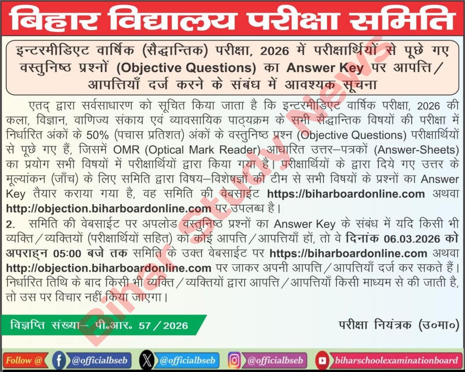 बिहार बोर्ड ने इंटर परीक्षा 2026 के Objective Questions की Answer Key जारी कर दी है।