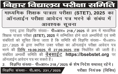 बिहार विद्यालय परीक्षा समिति (BSEB) ने माध्यमिक शिक्षक पात्रता परीक्षा (STET) 2025 की आधिकारिक अधिसूचना जारी कर दी है। यह परीक्षा उन अभ्यर्थियों के लिए महत्वपूर्ण अवसर है जो बिहार में माध्यमिक और उच्च माध्यमिक विद्यालयों में शिक्षक बनने का सपना देखते हैं।