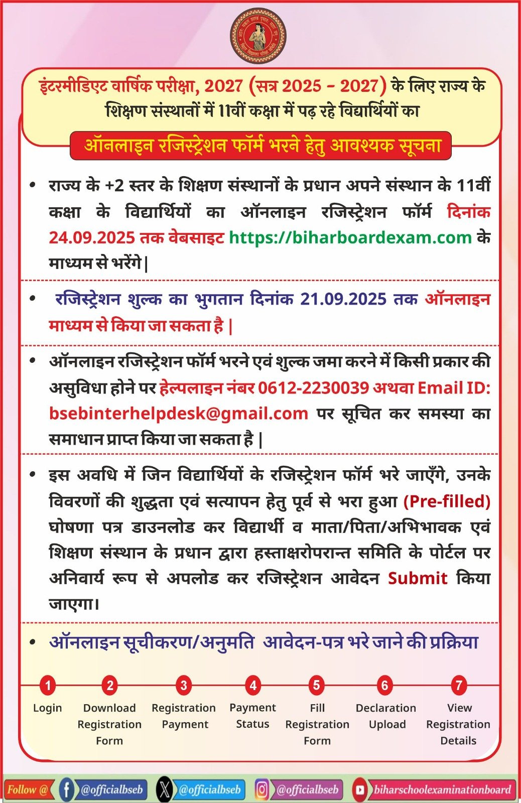 - यही रजिस्ट्रेशन आगे चलकर इंटर परीक्षा 2027 (12th Board Exam) में बैठने का आधार बनेगा।