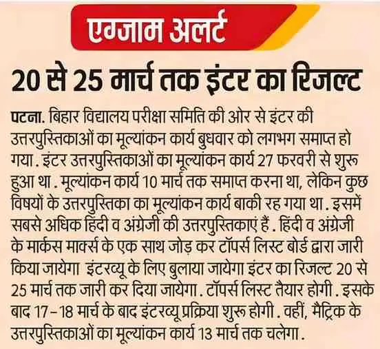 हिंदी व अंग्रेजी के मार्क्स को एक साथ जोड़ कर टॉपर्स लिस्ट बोर्ड द्वारा जारी किया जाएगा। इंटरव्यू के लिए बुलाया जाएगा। इंटर का रिजल्ट 20 से 25 मार्च तक जारी कर दिया जाएगा। टॉपर्स लिस्ट तैयार होगी। इसके बाद 17-18 मार्च के बाद इंटरव्यू प्रक्रिया शुरू होगी। वहीं, मैट्रिक के उत्तरपुस्तिकाओं का मूल्यांकन कार्य 13 मार्च तक चलेगा।