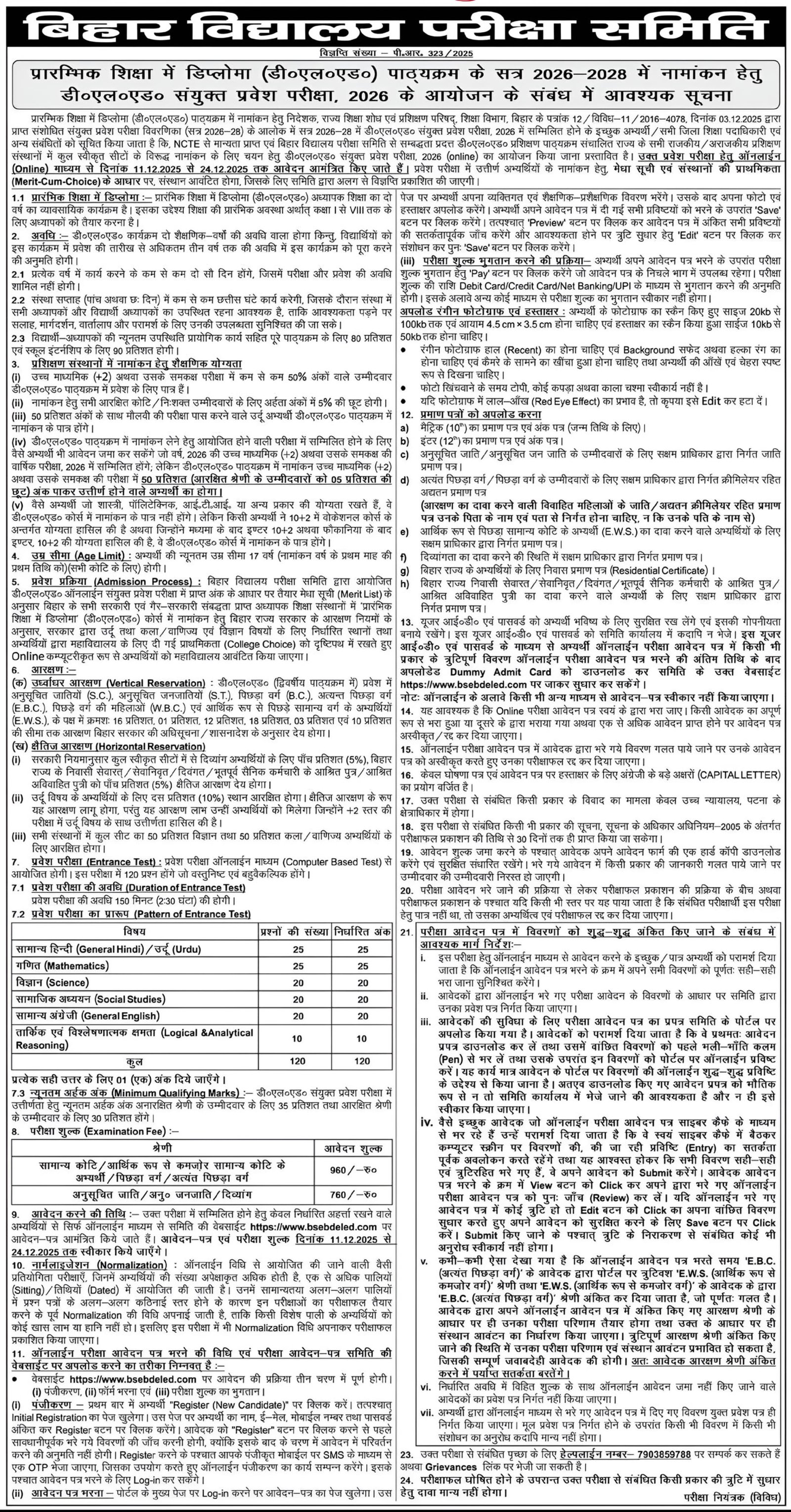 बिहार विद्यालय परीक्षा समिति (BSEB), पटना ने प्राथमिक शिक्षा में डिप्लोमा (DElEd) पाठ्यक्रम के लिए संयुक्त प्रवेश परीक्षा 2026 का आधिकारिक नोटिफिकेशन जारी कर दिया है। इस परीक्षा के आधार पर सत्र 2026–2028 में सभी सरकारी और मान्यता प्राप्त DElEd प्रशिक्षण कॉलेजों में नामांकन किया जाएगा।