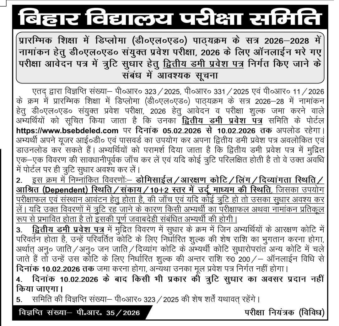 बिहार विद्यालय परीक्षा समिति (BSEB) द्वारा प्रारंभिक शिक्षा में डिप्लोमा (D.El.Ed) सत्र 2026–2028 में नामांकन हेतु आयोजित होने वाली DElEd संयुक्त प्रवेश परीक्षा 2026 के लिए द्वितीय डमी प्रवेश पत्र (2nd Dummy Admit Card) जारी करने की अधिसूचना जारी कर दी गई है।