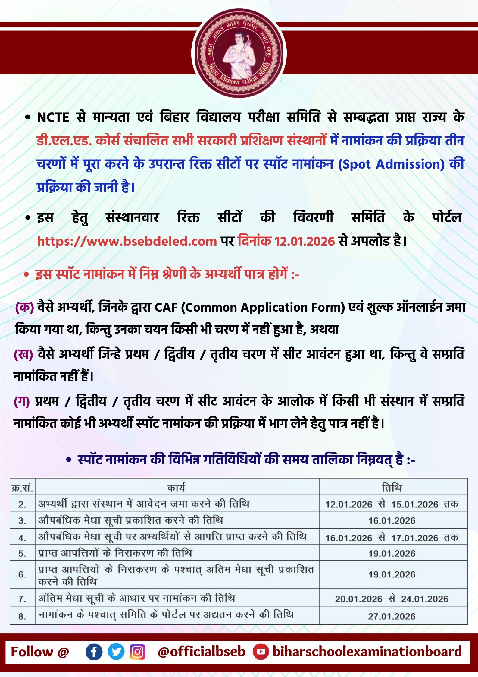 डी.एल.एड. 2025–27 का स्पॉट नामांकन बिहार विद्यालय परीक्षा समिति (BSEB) के निर्देशानुसार किया जा रहा है।