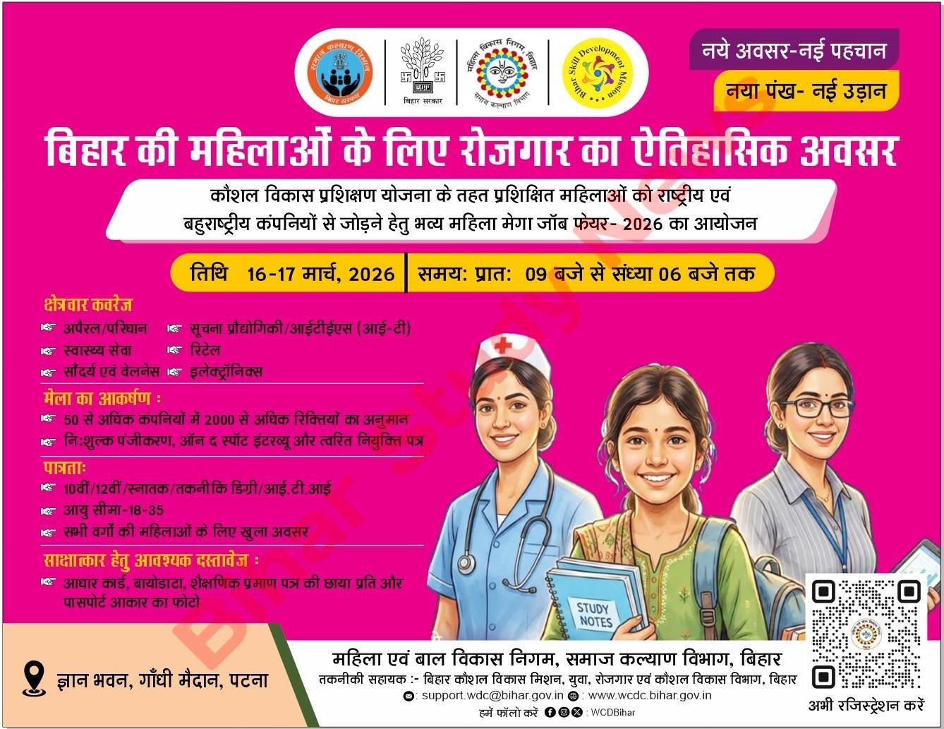 Bihar Rojgar Mela Registration 2026: क्या आप बिहार की महिला हैं और एक अच्छी नौकरी की तलाश में हैं, तो आपके लिए एक बहुत बड़ी खुशखबरी है क्योंकि Bihar Rojgar Mela Registration 2026 शुरू हो चुका है। बिहार सरकार की महिला एवं बाल विकास निगम (WCDC) और कौशल विकास मिशन ने भव्य महिला मेगा जॉब फेयर 2026 का आयोजन किया है जिसमें 50 से ज्यादा National और Multinational Companies आएंगी और 2000 से ज्यादा नौकरियों के पदों को भरा जाएगा।