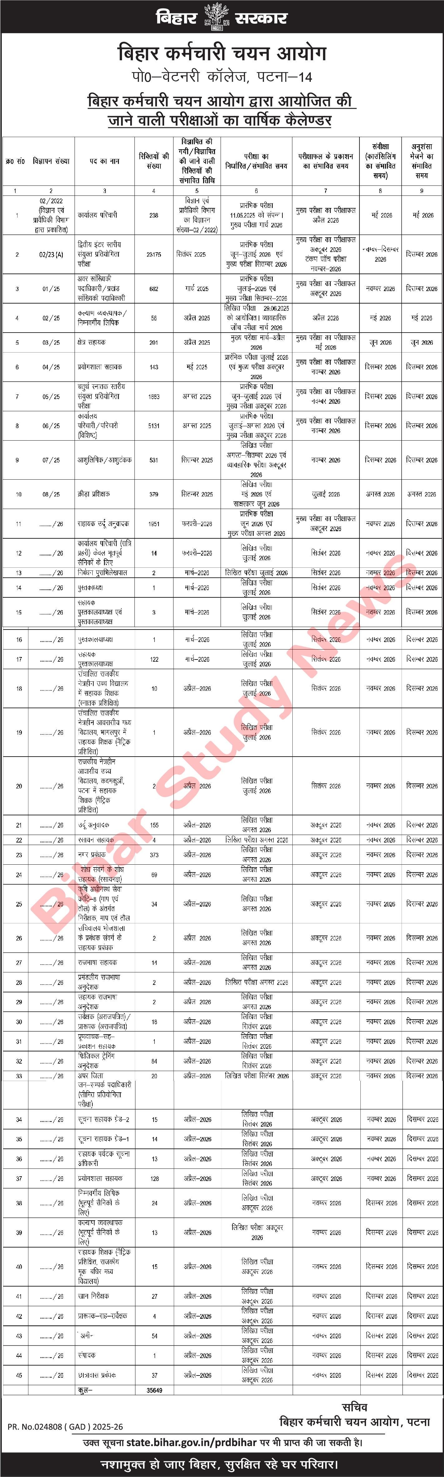 बिहार कर्मचारी चयन आयोग (BSSC) द्वारा वर्ष 2026 का वार्षिक परीक्षा कैलेंडर आधिकारिक रूप से जारी कर दिया गया है। इसमें विभिन्न भर्तियों की संभावित परीक्षा तिथियाँ दी गई हैं।