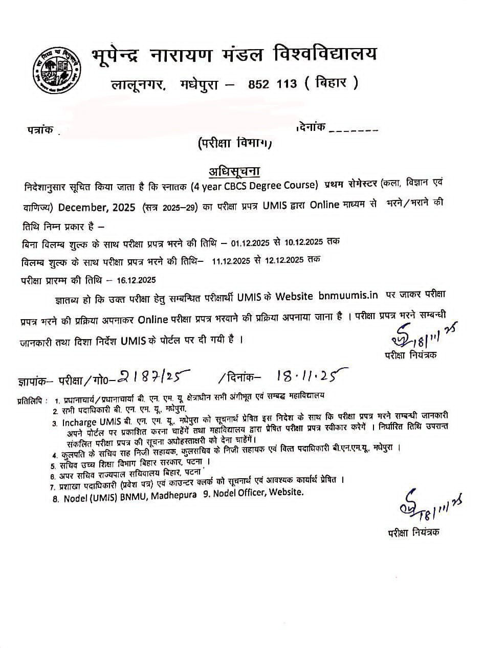 भूपेन्द्र नारायण मंडल विश्वविद्यालय (BNMU), मधेपुरा ने स्नातक 4-Year CBCS कोर्स (Session 2025-29) के प्रथम सेमेस्टर की परीक्षा के लिए ऑनलाइन फॉर्म भरने का कार्यक्रम जारी कर दिया है। विश्वविद्यालय की ओर से जारी आधिकारिक अधिसूचना के अनुसार परीक्षा फॉर्म UMIS Portal (bnmuumis.in) के माध्यम से भरा जाएगा। यह सूचना सभी कॉलेजों, छात्रों तथा संबंधित विभागों को भेज दी गई है।