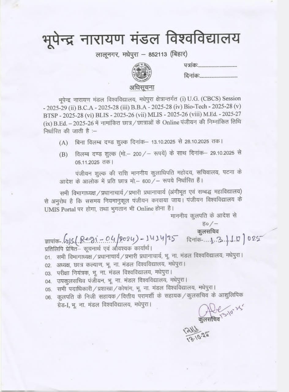 भूपेन्द्र नारायण मंडल विश्वविद्यालय यूजी 1st Sem पंजीकरण शुरू