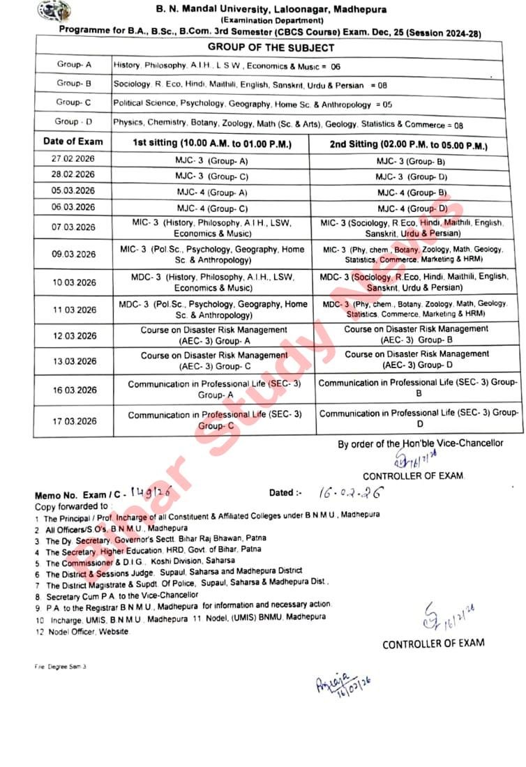 BNMU Madhepura UG 3rd Sem Exam Programme 2026