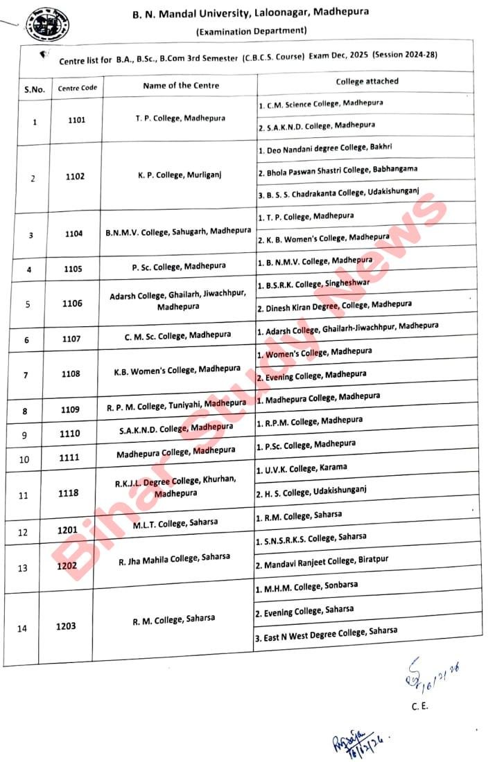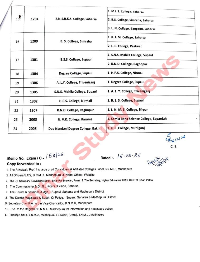 भूपेंद्र नारायण मंडल विश्वविद्यालय (BNMU), ललूनगर मधेपुरा ने स्नातक तृतीय सेमेस्टर (UG 3rd Semester) परीक्षा 2026 का आधिकारिक एग्जाम प्रोग्राम और सेंटर लिस्ट जारी कर दिया है। यह परीक्षा CBCS कोर्स (Choice Based Credit System) के अंतर्गत आयोजित की जाएगी। विश्वविद्यालय द्वारा जारी नोटिस के अनुसार परीक्षा फरवरी के अंतिम सप्ताह से शुरू होकर मार्च 2026 के मध्य तक चलेगी।