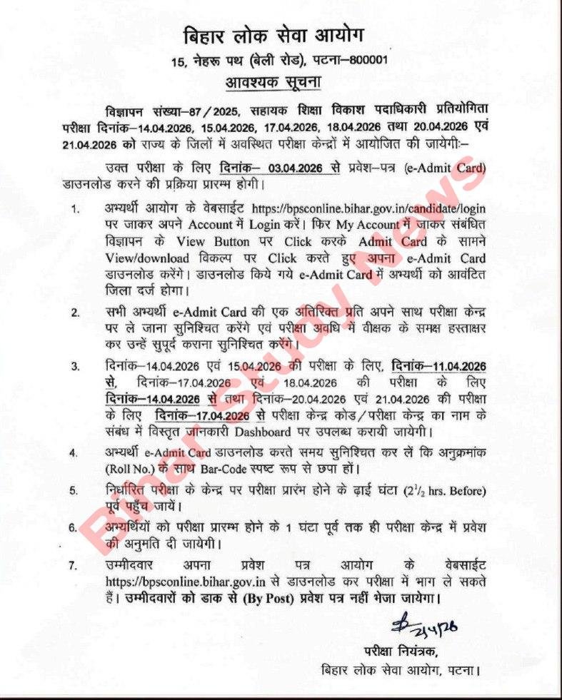 बिहार लोक सेवा आयोग (BPSC) ने सहायक शिक्षा विकास पदाधिकारी (AEDO) भर्ती परीक्षा 2026 के लिए एडमिट कार्ड जारी कर दिया है। जिन उम्मीदवारों ने इस भर्ती के लिए आवेदन किया था, वे अब अपना e-Admit Card आधिकारिक वेबसाइट से डाउनलोड कर सकते हैं। आयोग द्वारा जारी नोटिस के अनुसार, एडमिट कार्ड डाउनलोड करने की प्रक्रिया 03 अप्रैल 2026 से शुरू हो चुकी है।