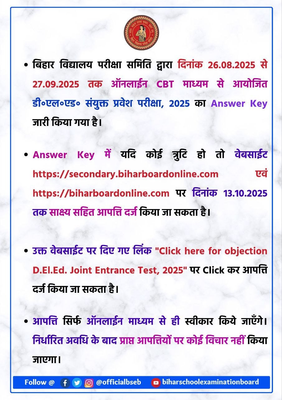 Bihar DElEd प्रवेश परीक्षा 2025 की उत्तर कुंजी (Answer Key) जारी होने के बाद, यदि किसी प्रश्न या उत्तर में कोई त्रुटि लगे, तो उम्मीदवार निर्धारित समय में आपत्ति (Objection) दर्ज कर सकते हैं।