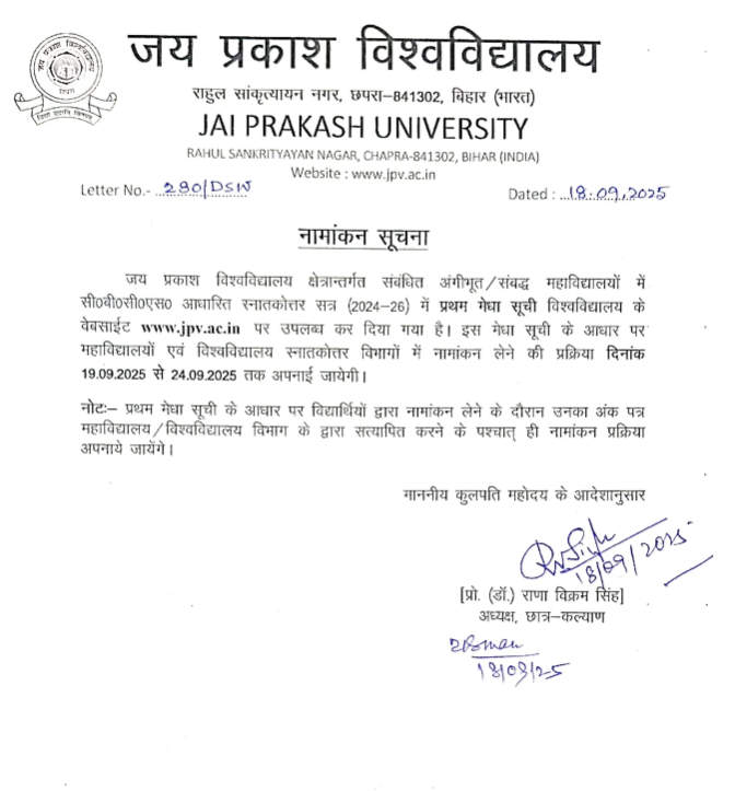 JPU Chhapra PG 1st Sem Admission 1st Merit List 2025