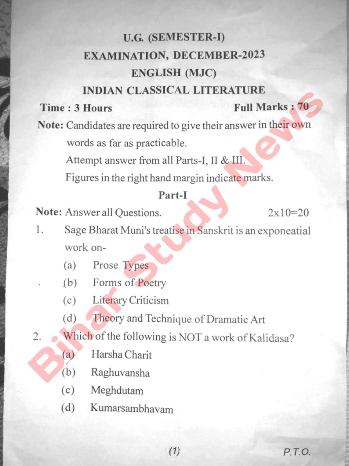 Purnea University BA 1st Sem English MJC-I 2023 Question Paper
