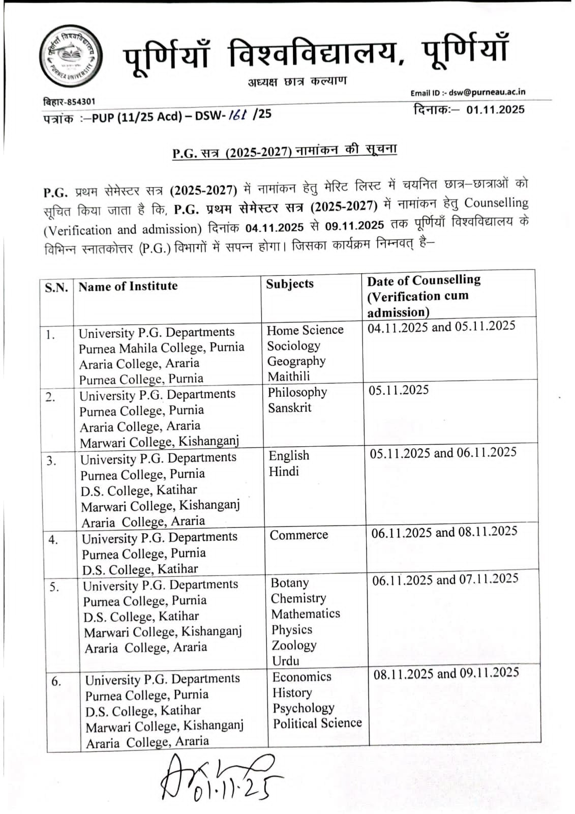 विश्वविद्यालय ने अपने आधिकारिक नोटिस (पत्रांक–PUP/25–Acd/DSW–161/25 दिनांक–01.11.2025) में बताया है कि विभिन्न विषयों के लिए काउंसलिंग निम्नलिखित तिथियों पर होगी —