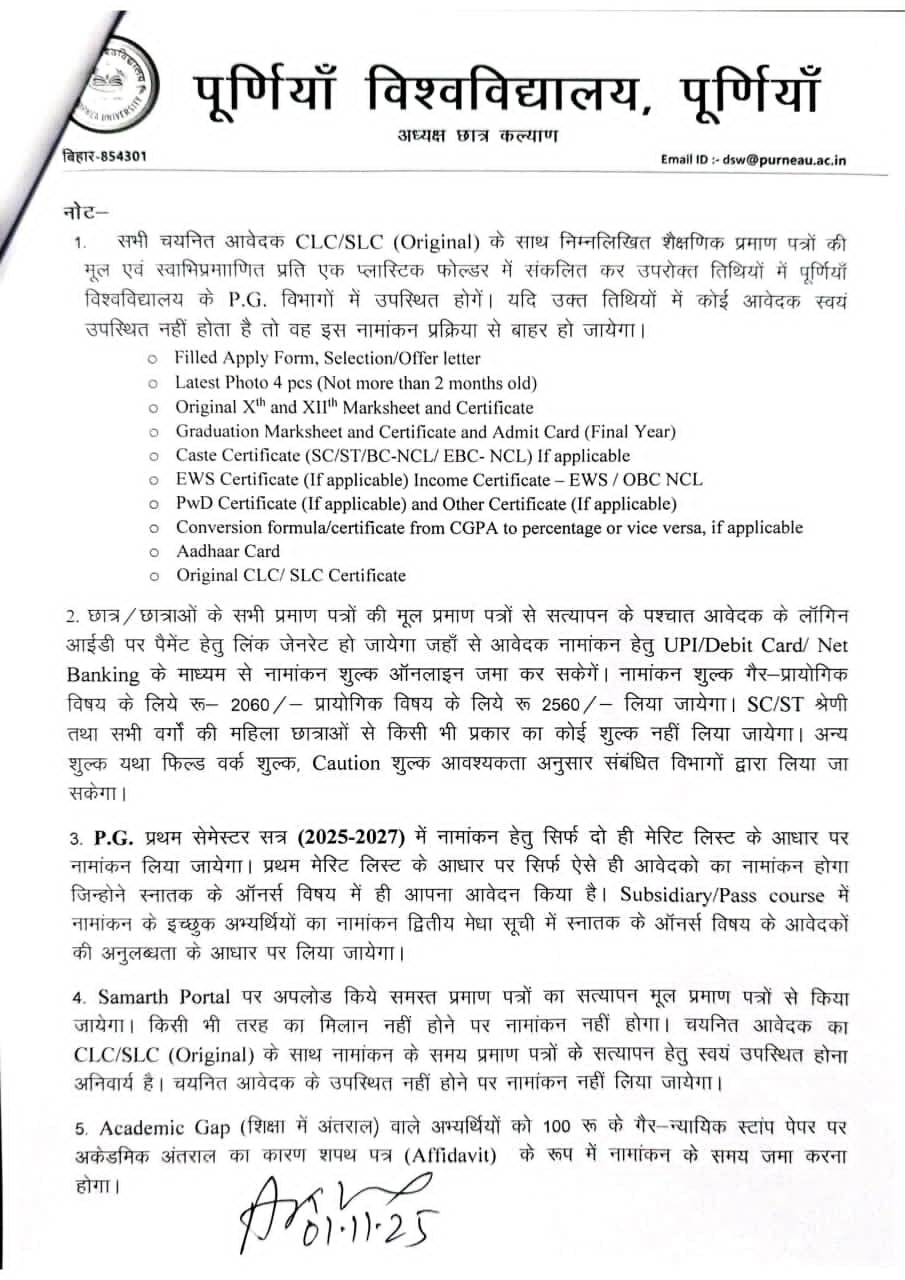 पूर्णिया विश्वविद्यालय ने सूचित किया है कि P.G. प्रथम सेमेस्टर सत्र (2025–2027) में नामांकन केवल Merit List में चयनित छात्रों के लिए किया जाएगा।