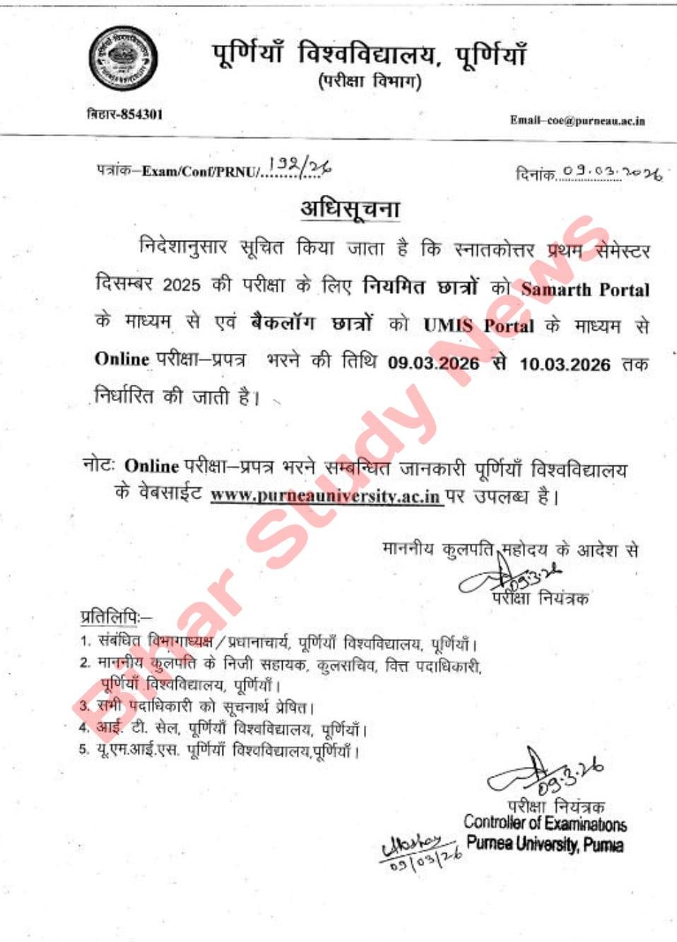 पूर्णिया विश्वविद्यालय (Purnea University) ने स्नातकोत्तर प्रथम सेमेस्टर (PG 1st Semester) दिसंबर 2025 परीक्षा के लिए परीक्षा फॉर्म भरने की तिथि जारी कर दी है। परीक्षा विभाग द्वारा जारी आधिकारिक अधिसूचना के अनुसार, सभी योग्य विद्यार्थियों को Samarth Portal के माध्यम से ऑनलाइन परीक्षा फॉर्म भरना अनिवार्य होगा।