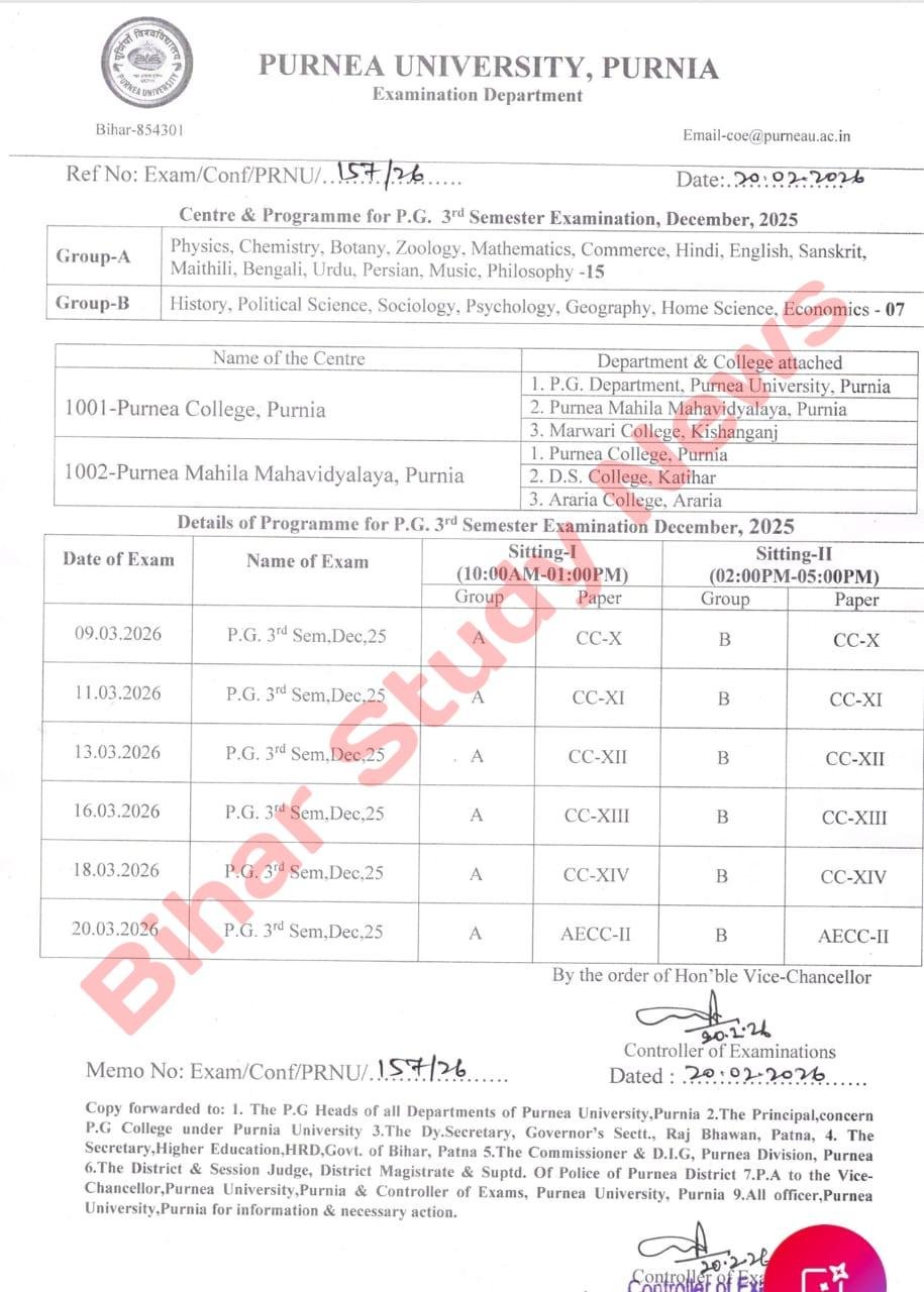 Purnea University PG 3rd Semester Exam Programme 2026 (Session Dec 2025)