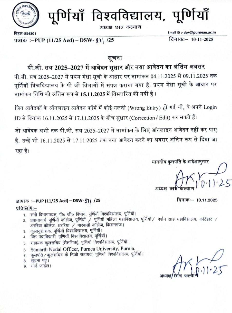 विश्वविद्यालय की ओर से जारी पत्रांक PUP (11/25 Acd) – DSW–171/25 के अनुसार, पहली मेरिट सूची के आधार पर नामांकन की अंतिम तिथि 15 नवंबर 2025 तक बढ़ा दी गई है।