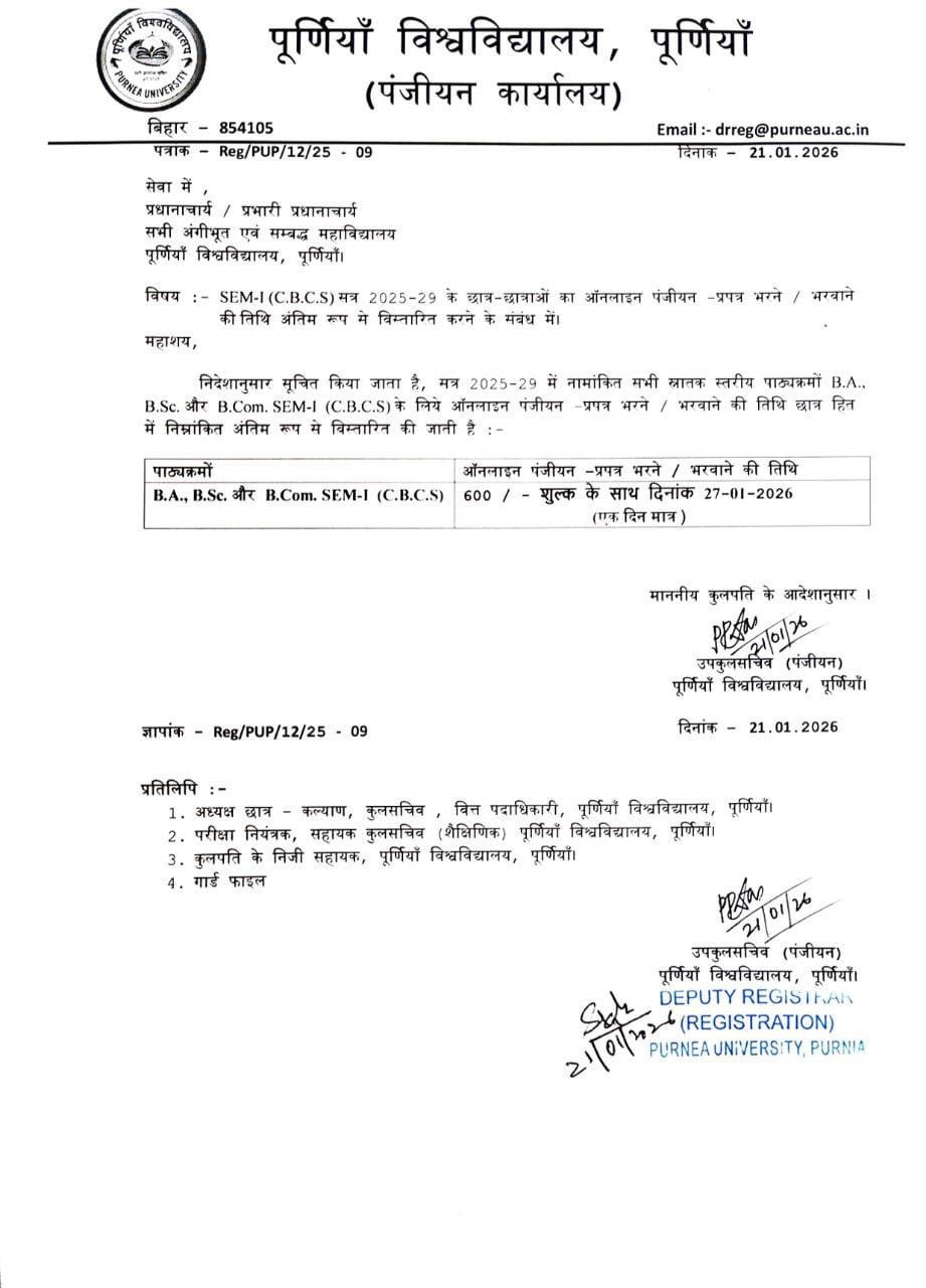 Purnea University से स्नातक (UG) कोर्स में नामांकन लेने वाले छात्रों के लिए एक महत्वपूर्ण अपडेट सामने आया है। विश्वविद्यालय ने UG 1st Semester (CBCS) Session 2025–29 के लिए ऑनलाइन रजिस्ट्रेशन की तिथि बढ़ा दी है। यह सूचना विश्वविद्यालय के पंजीयन कार्यालय द्वारा जारी आधिकारिक नोटिस के माध्यम से दी गई है। ऐसे सभी छात्र जो किसी कारणवश अब तक रजिस्ट्रेशन नहीं कर पाए थे, उनके लिए यह अंतिम अवसर माना जा रहा है।