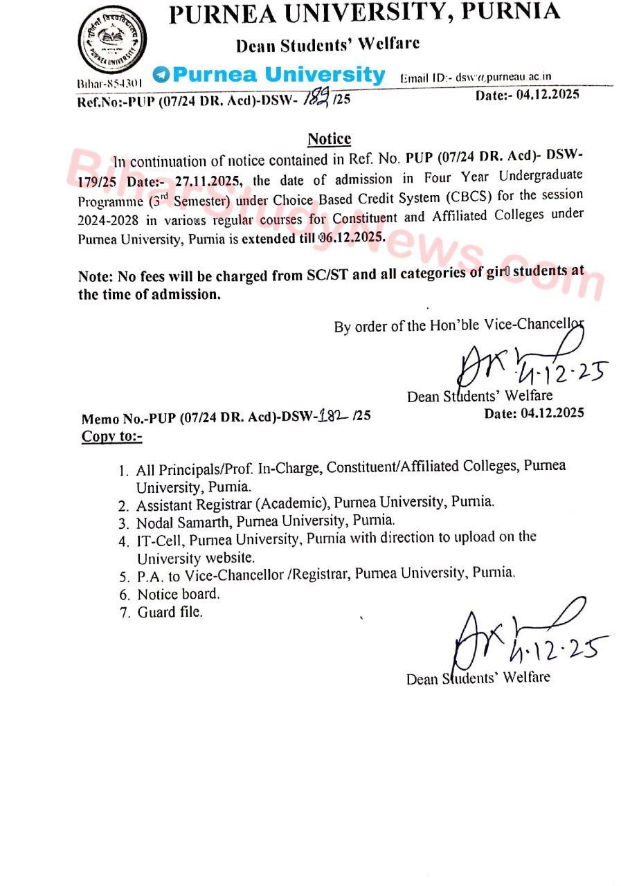 Purnea University ने स्नातक (UG) तृतीय सेमेस्टर (3rd Sem) में नामांकन लेने वाले छात्रों के लिए एक अहम सूचना जारी की है। विश्वविद्यालय के Dean Students’ Welfare (DSW) कार्यालय द्वारा जारी नोटिस के अनुसार, चार वर्षीय स्नातक कार्यक्रम (Four Year UG Programme) के अंतर्गत CBCS प्रणाली में पढ़ रहे विद्यार्थियों के लिए 3rd Semester में एडमिशन की तिथि बढ़ा दी गई है। पहले जारी सूचना के क्रम में अब छात्र 06 दिसंबर 2025 तक अपने संबंधित कॉलेजों में नामांकन करा सकते हैं। यह निर्णय उन विद्यार्थियों के लिए राहतभरा है जो किसी कारणवश तय समय-सीमा में एडमिशन नहीं ले पाए थे।
